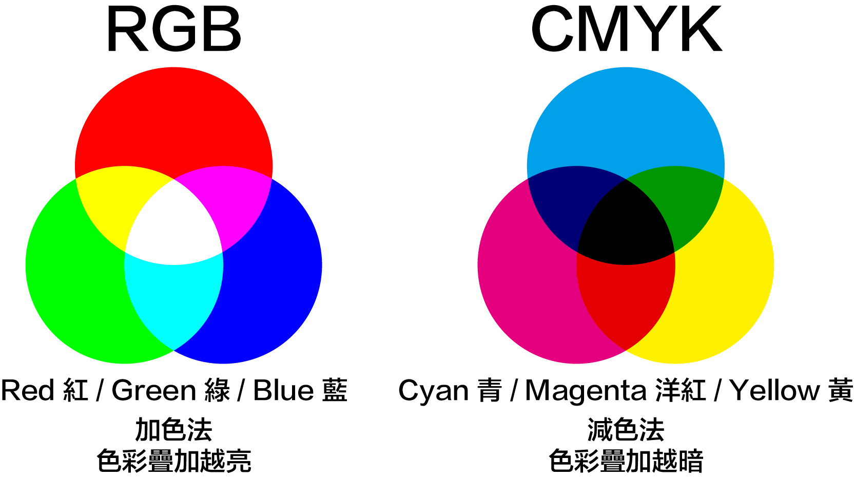 RGB為加色法(顏色疊加越亮);CMYK則為減色法(顏色疊加越暗),故兩者在轉換時必產生誤差,建議一開始設計檔案就使用CMYK色彩模式製作,避免使用RGB色彩模式到時轉色時造成跑色問題,萬不得已需進行轉色後也請務必確認轉檔後顏色是否有問題。